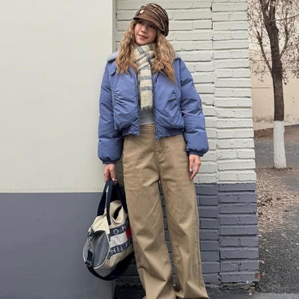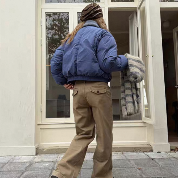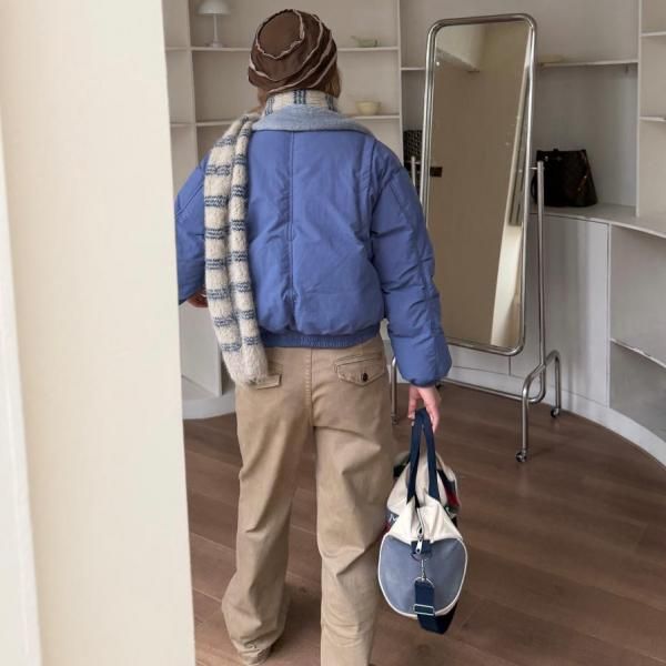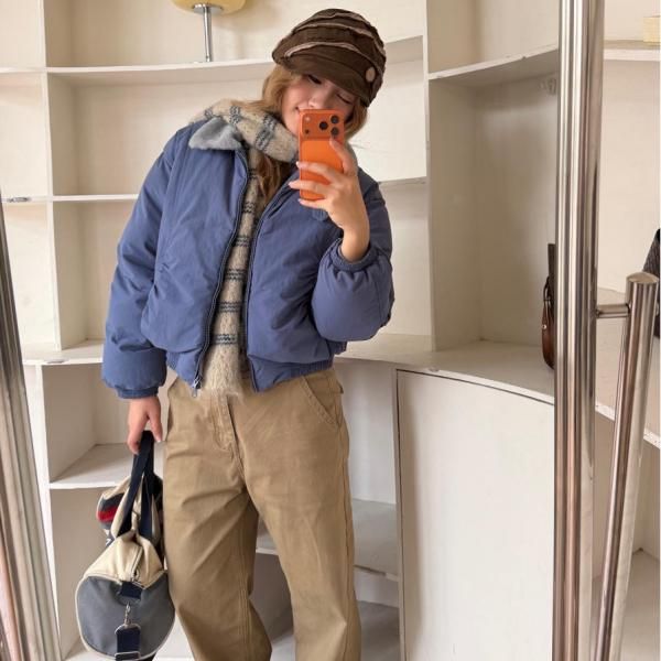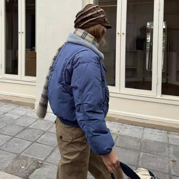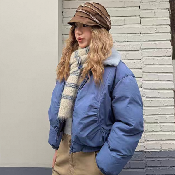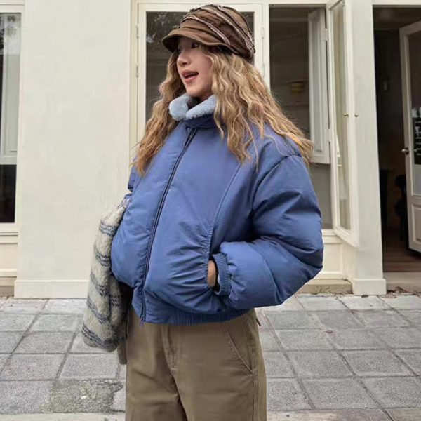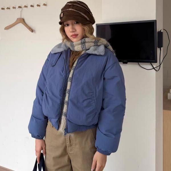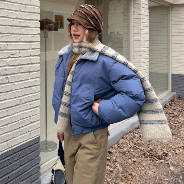 ブルーxグレー ショート丈 襟付き フェイクファーカラー ダウンジャケット パファージャケット ブルゾン ワンホン が入荷しました。
