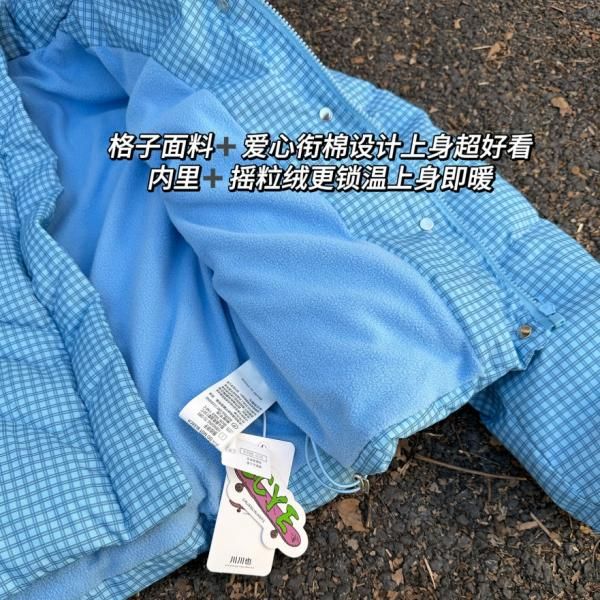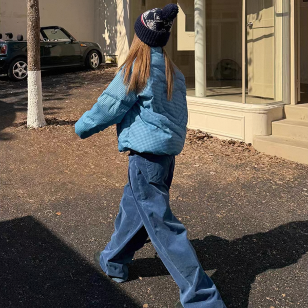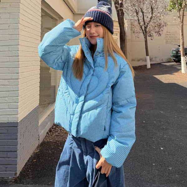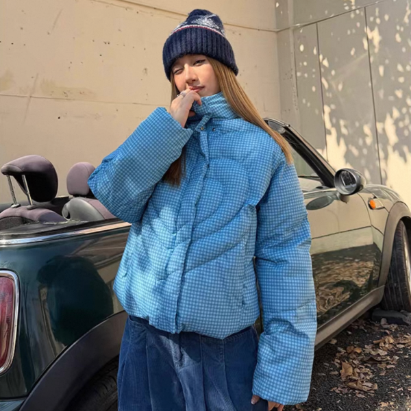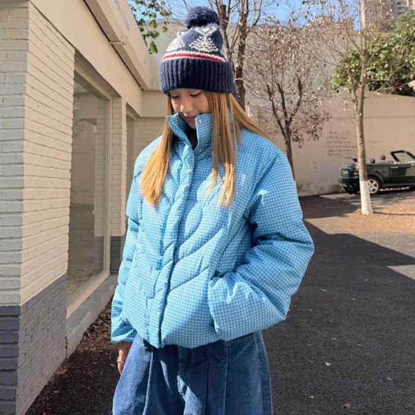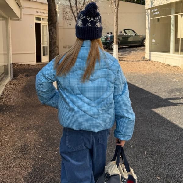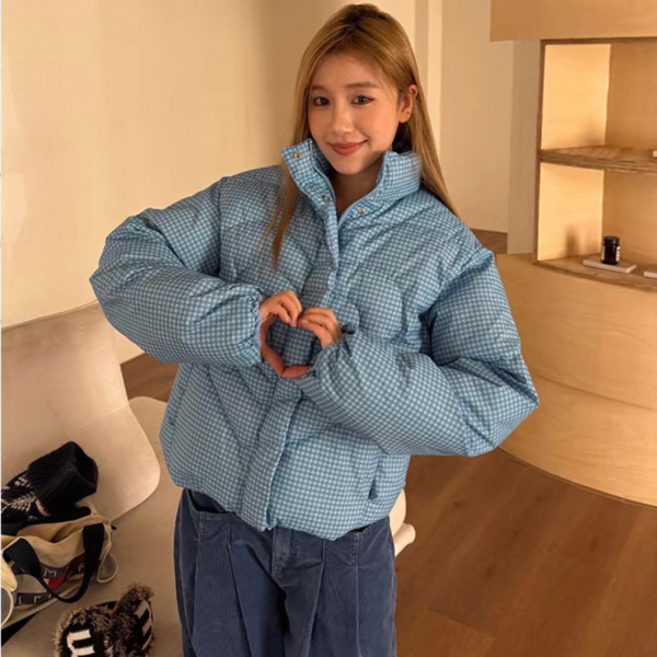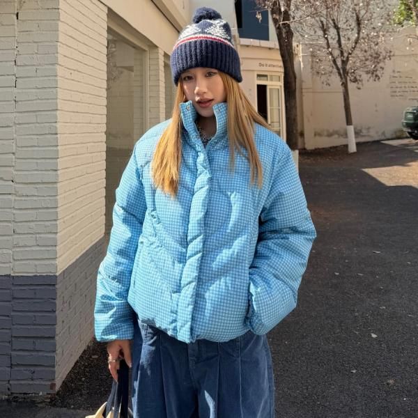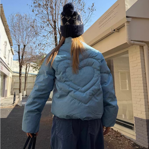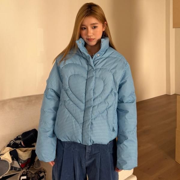 ブルー ギンガムチェック柄 ハートデザイン スタンドカラー パファージャケット ダウンジャケット キルティングジャケット ブルゾン ワンホンが入荷しました。