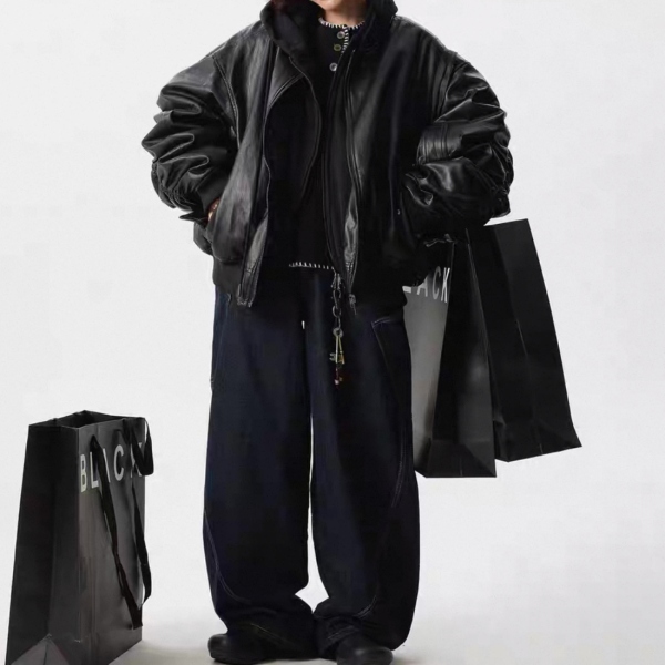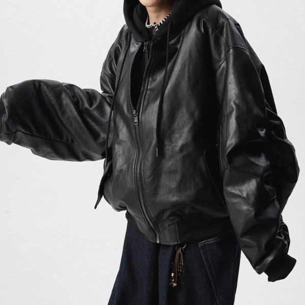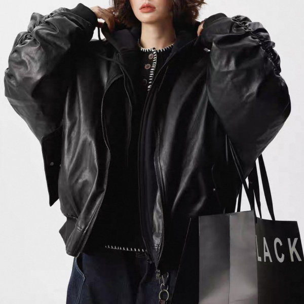 【大特価】H GANG X ブラック レイヤード 重ね着風 シャーリングスリーブ ギャザー フェイクレザージャケット 合皮 ボンバージャケット ブルゾン ワンホン