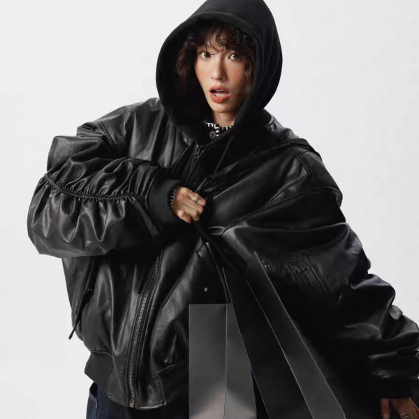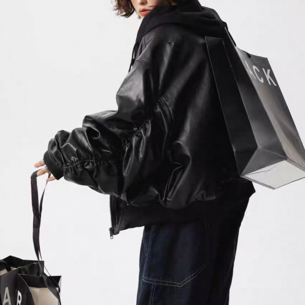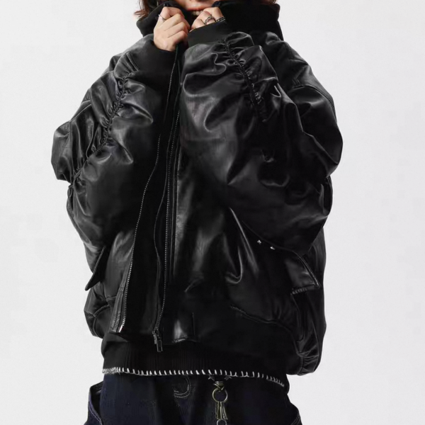 H GANG X ブラック レイヤード 重ね着風 シャーリングスリーブ ギャザー フェイクレザージャケット 合皮 ボンバージャケット レザーブルゾン ジッパー ジップアップ ファスナー ワンホンが入荷しました。