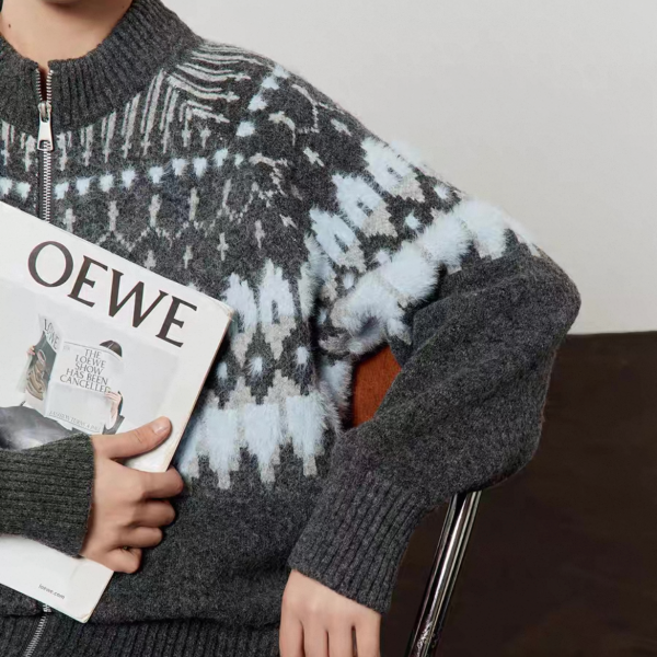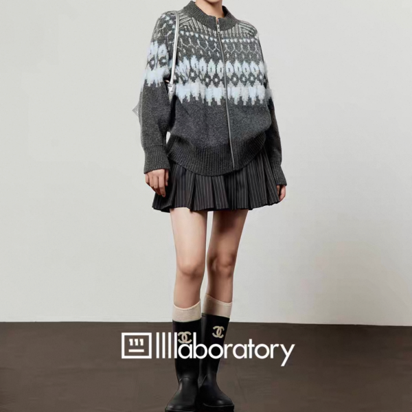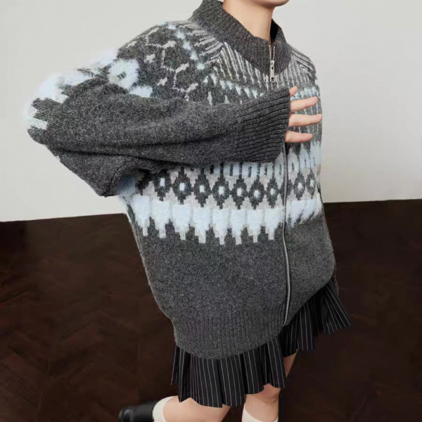 LLL LAB グレー ノルディック柄 総柄 ジッパー ジップアップ ファスナー スタンドカラー ニットジャケット セーター ワンホンが入荷しました。