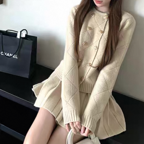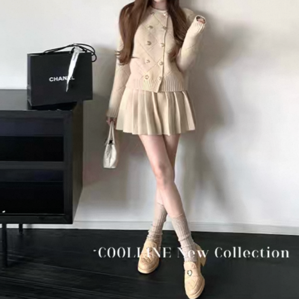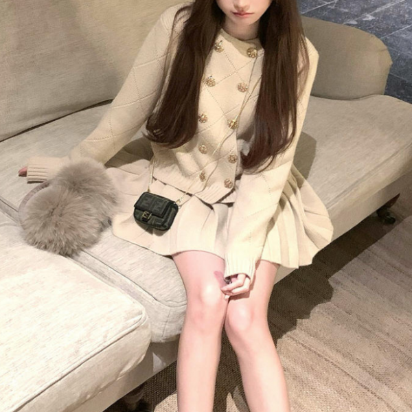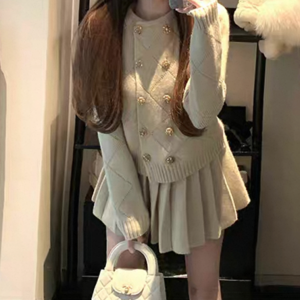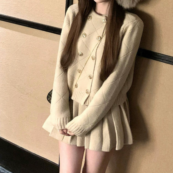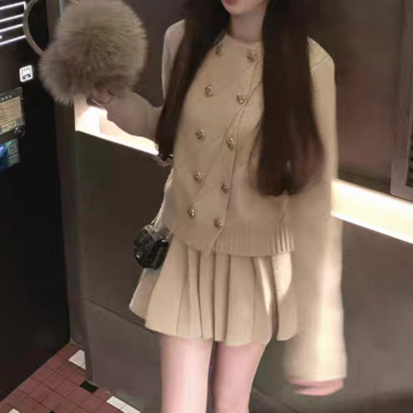 【大特価】ベージュ ダブルボタン クルーネック ニットカーディガン セーター トップス プリーツミニスカート ニットスカート ニットアップ セットアップ 韓国