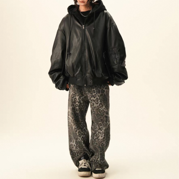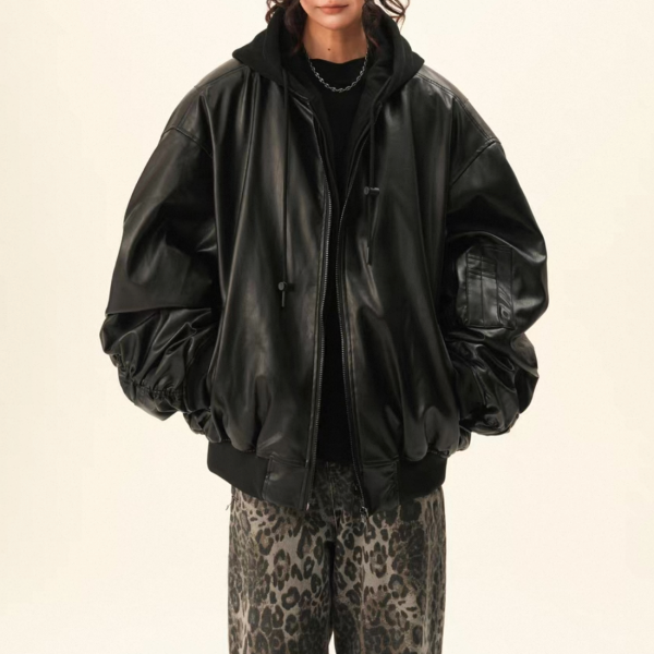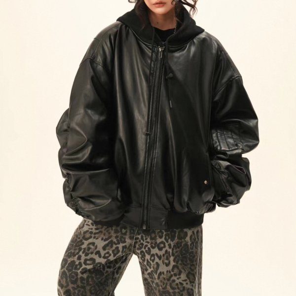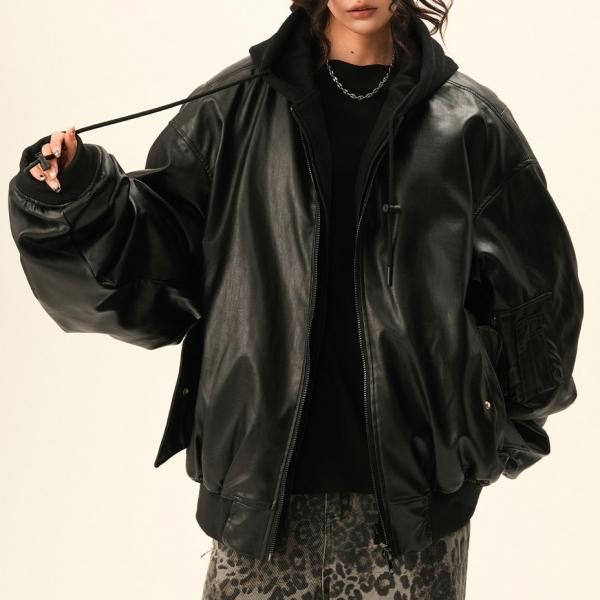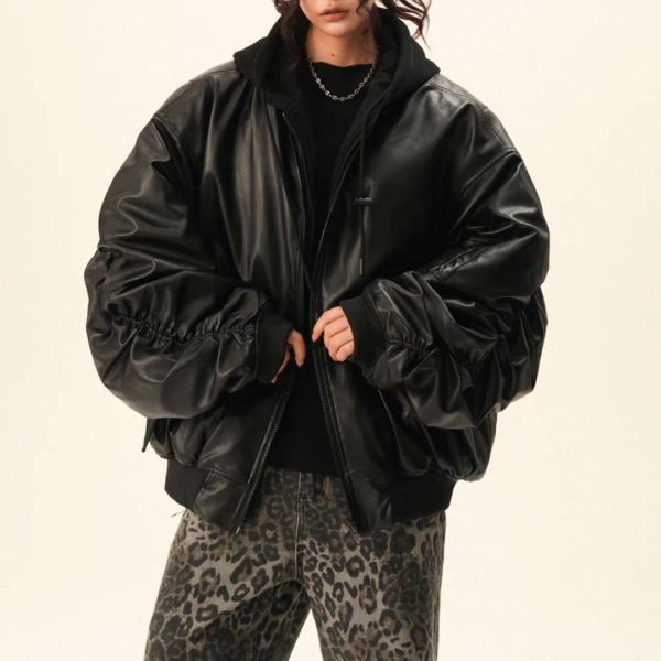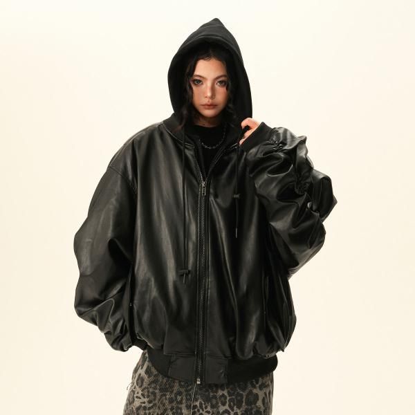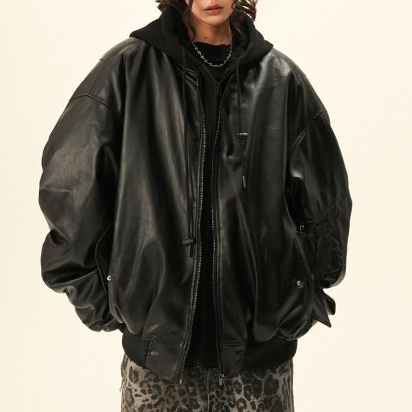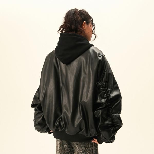 BWKA ユニセックス ビンテージ古着風 オーバーサイズ シャーリングスリーブ ギャザースリーブ ジッパー ジップアップ ファスナー レザーブルゾン レイヤード 重ね着風 パーカー フーディー レザージャケット ボンバージャケット ワンホンが入荷しました。