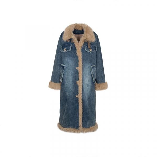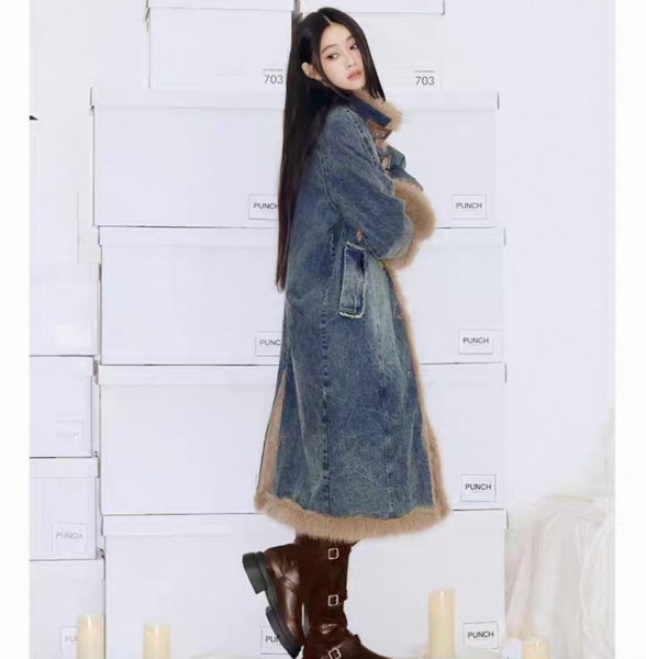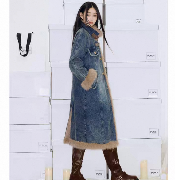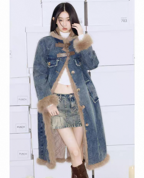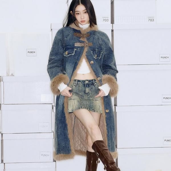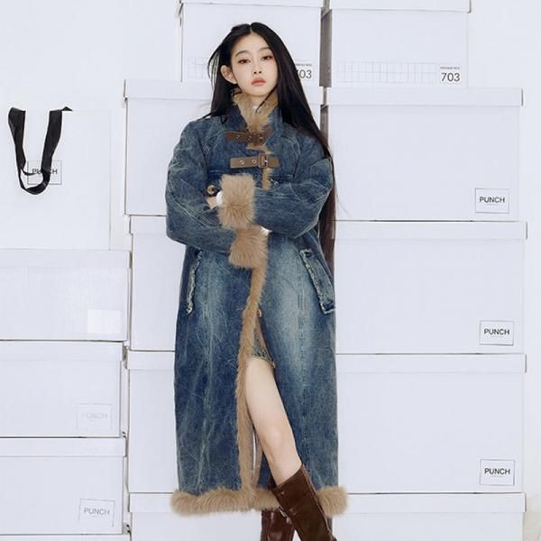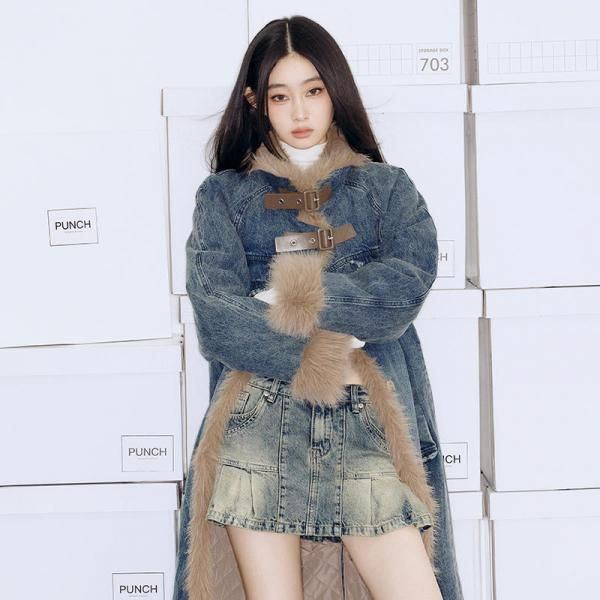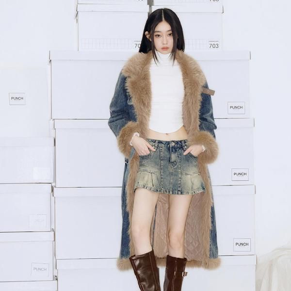 PUNCH ダークブルーxブラウン フェイクファートリム ファー襟 ファーカラー デニムコート デニムジャケット ロングコート ワンホンが入荷しました。