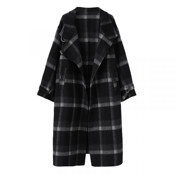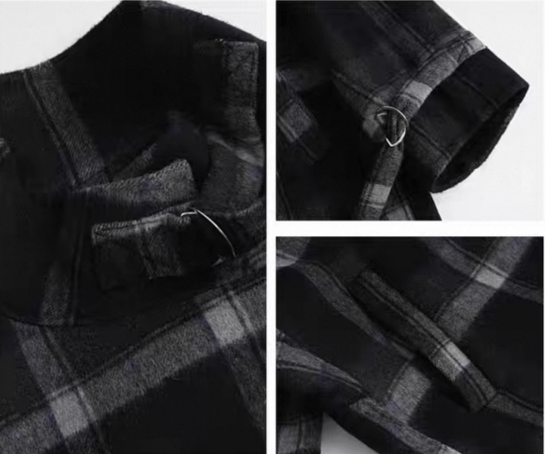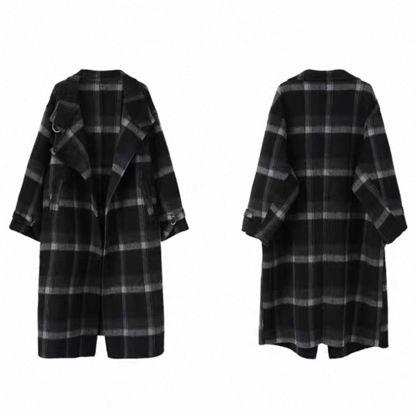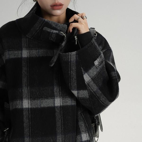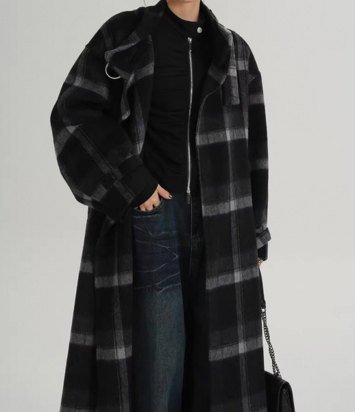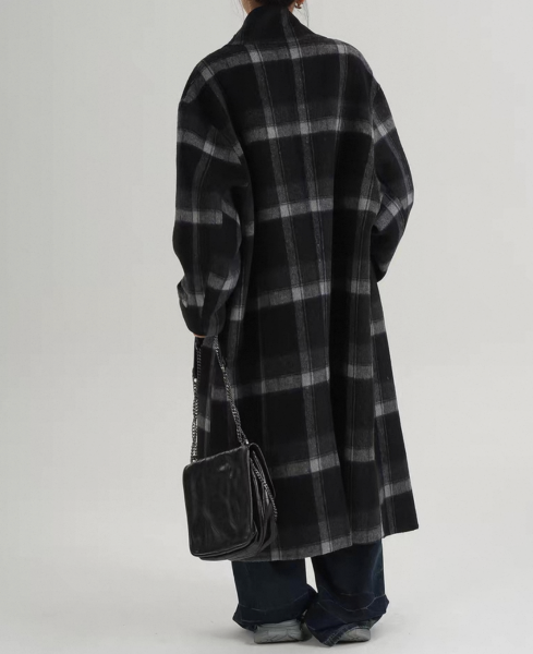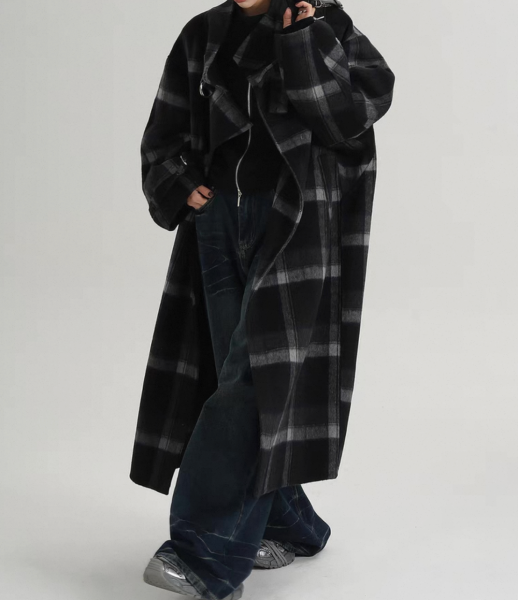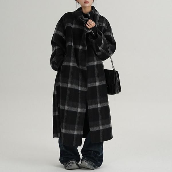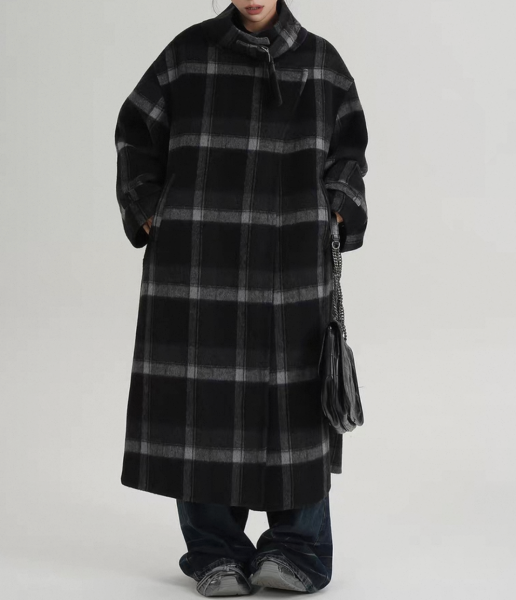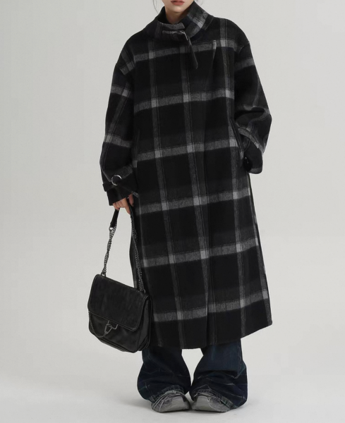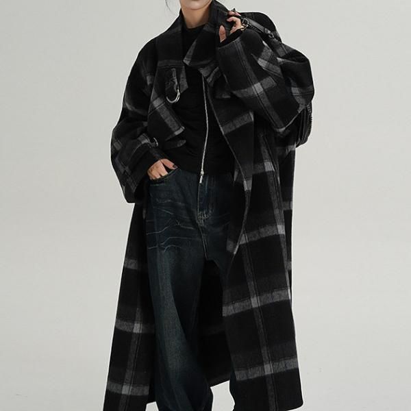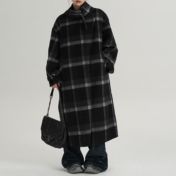 SRYS ブラック 総柄 チェック柄 スタンドカラー オーバーサイズ バックルストラップ ウール調 ロングコート ワンホンが入荷しました。