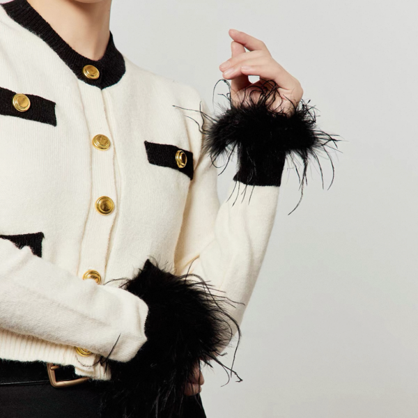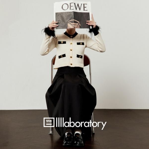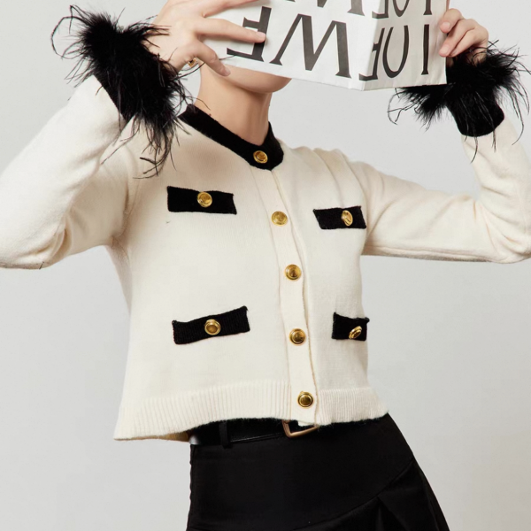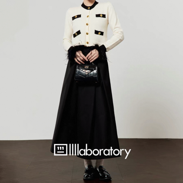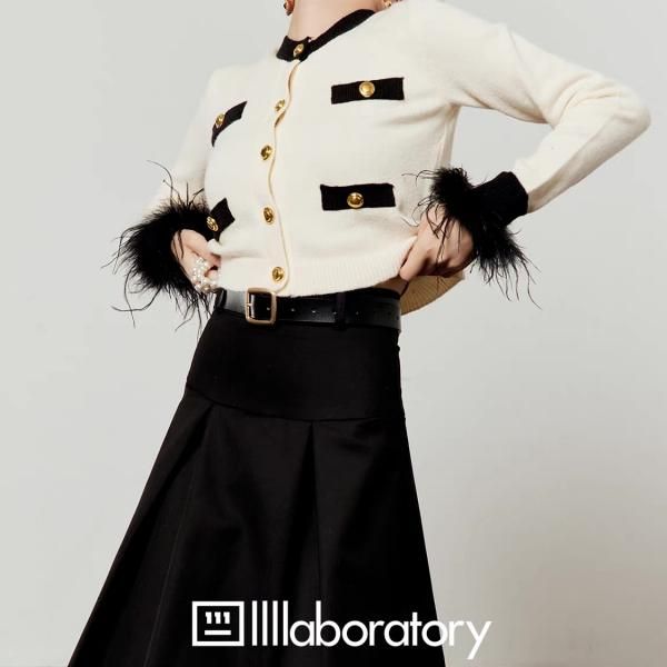 LLL LAB モノトーン ホワイト ブラックトリム ゴールドボタン ダブルポケット ファートリム ファースリーブ ニットカーディガン セーター トップス ワンホンが入荷しました。