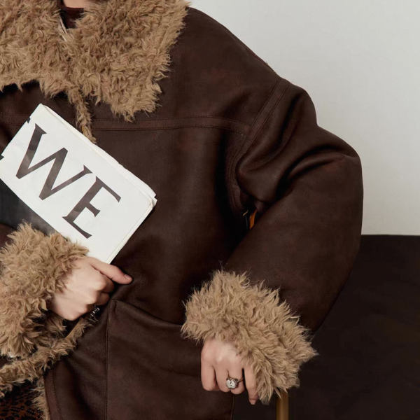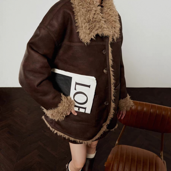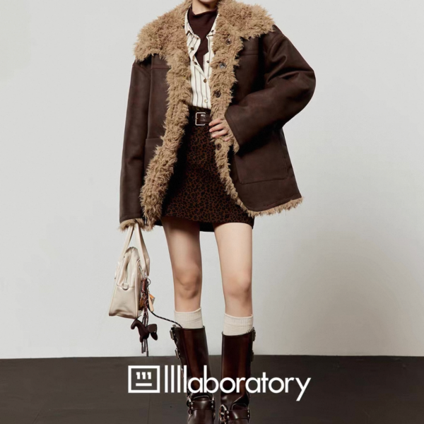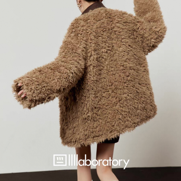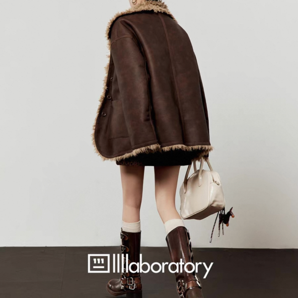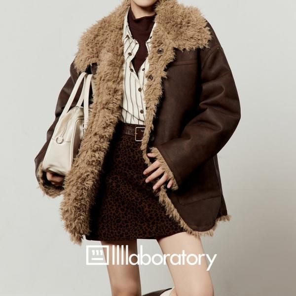 LLL LAB ブラウン フェイクムートンジャケット ミドル丈 フェイクムートンコート 襟付き ボアカラー ミドル丈 シングルボタン スエードジャケット ワンホンが入荷しました。