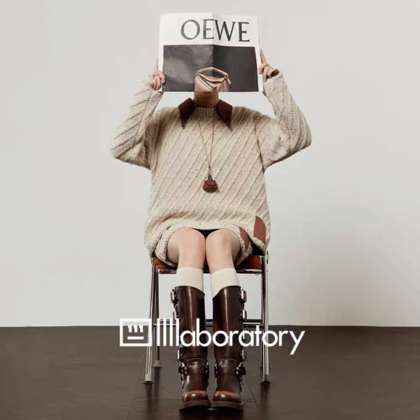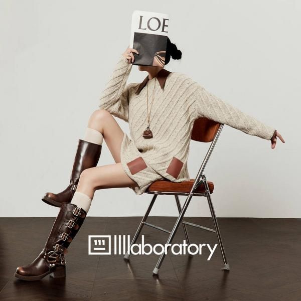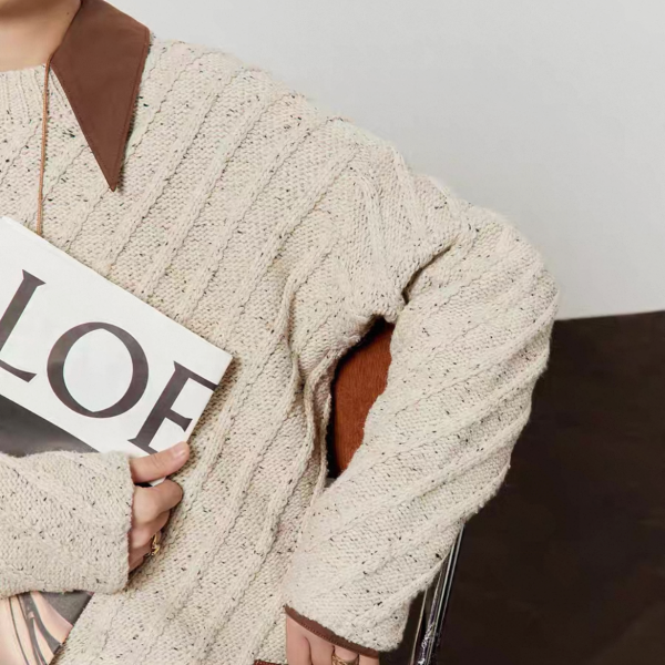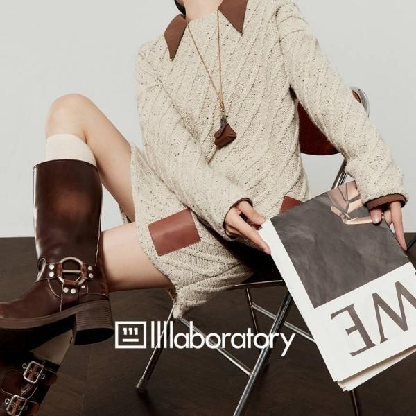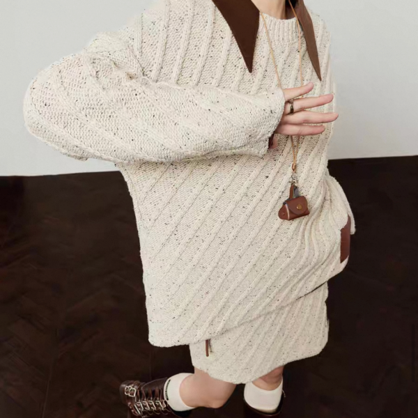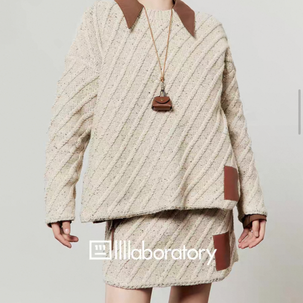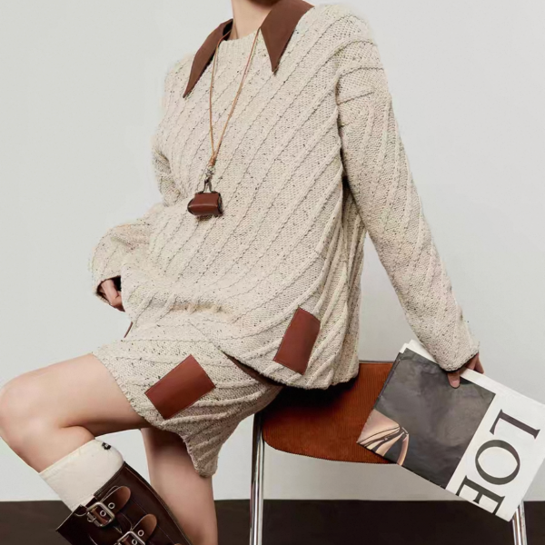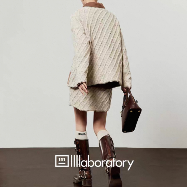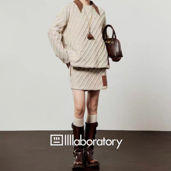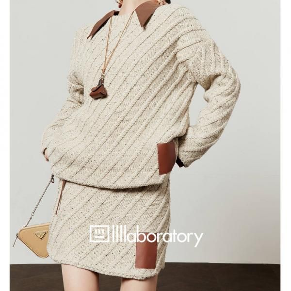 LLL LAB ベージュ バイカラー 襟付き オーバーサイズ ニット セーター トップス プルオーバー レザーパッチ ニットスカート ミニスカート セットアップ ニットアップ ワンホンが入荷しました。