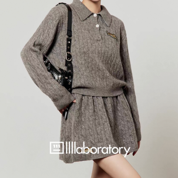 【大特価】LLL LAB グレー ケーブル編み 長袖 襟付き ニット セーター ニットポロシャツ 長袖 トップス ミニスカート ニットスカート セットアップ ニットアップ ワンホン