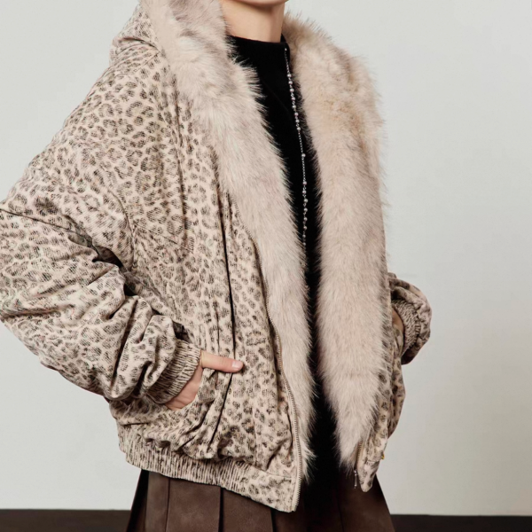 【大特価】LLL LAB ベージュ レオパード柄 ひょう柄 フェイクファートリム ジッパー パーカー フーディー ブルゾン ボンバージャケット ダウンジャケット ワンホン