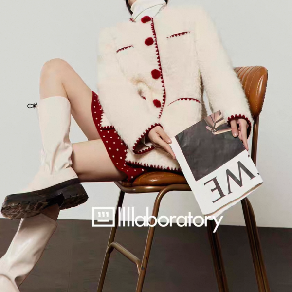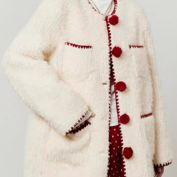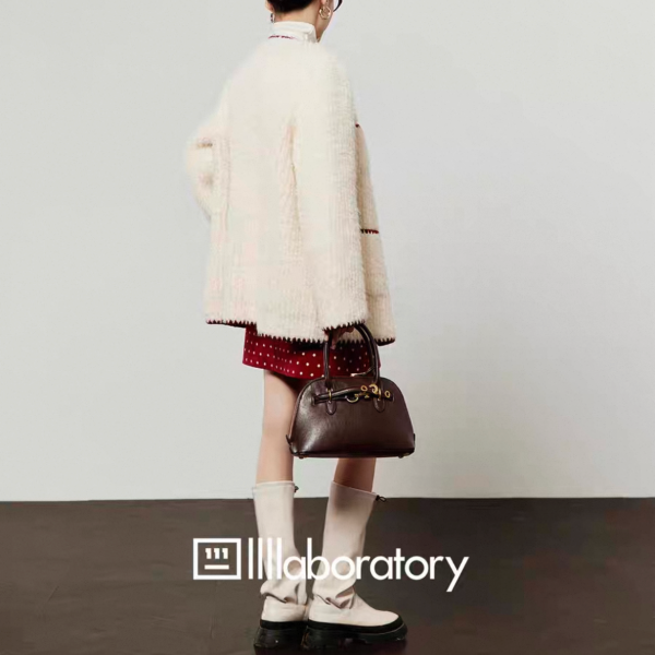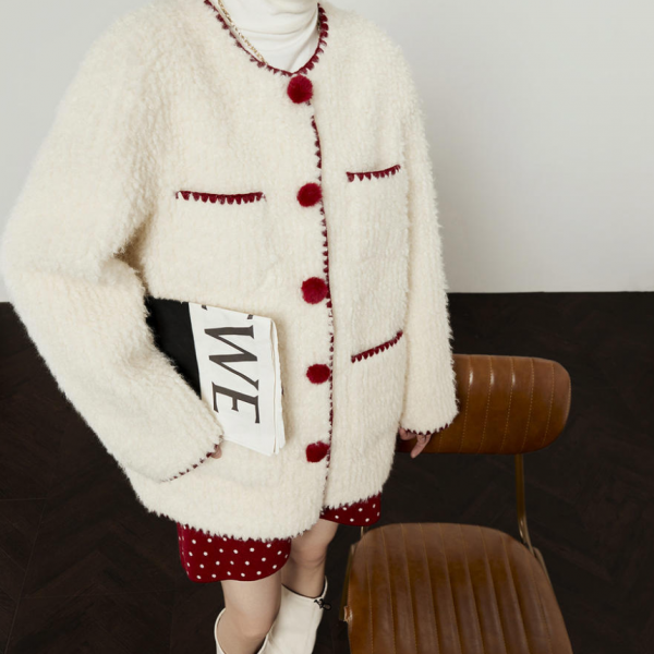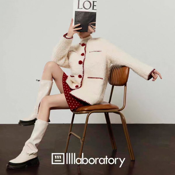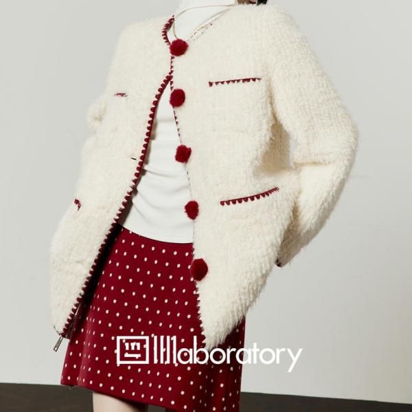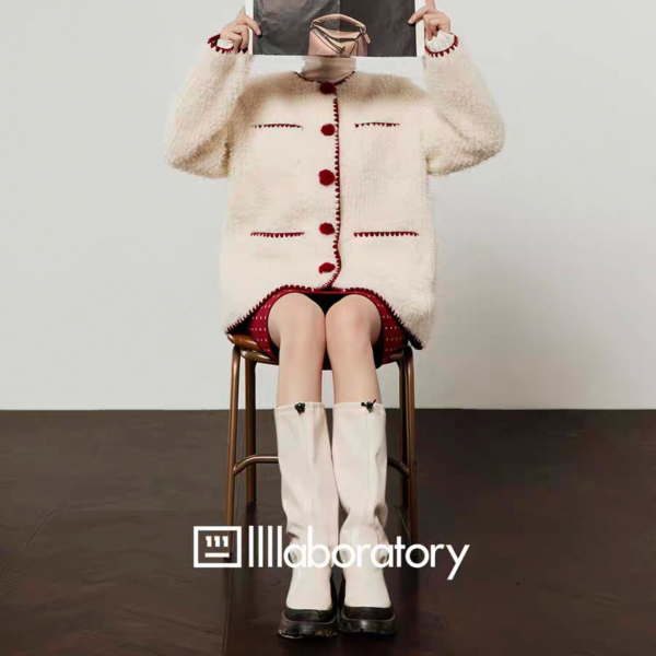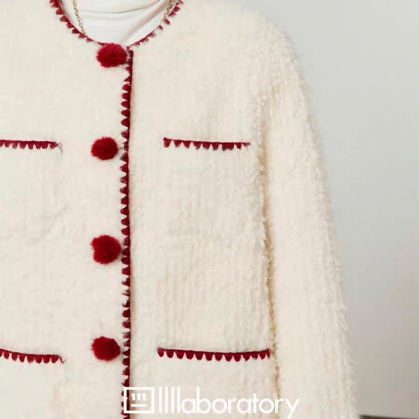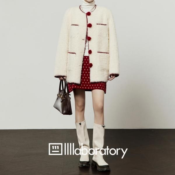 LLL LAB ホワイトxレッド トリムデザイン フロントボタン ダブルポケット ノーカラー ニットカーディガン セーター トップスが入荷しました。