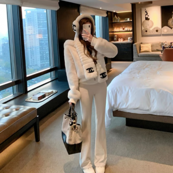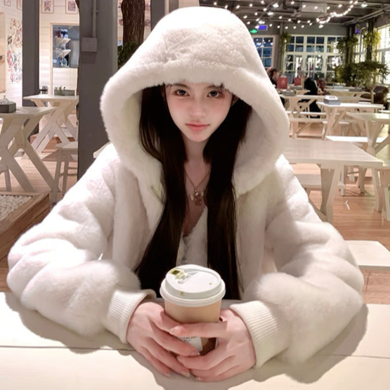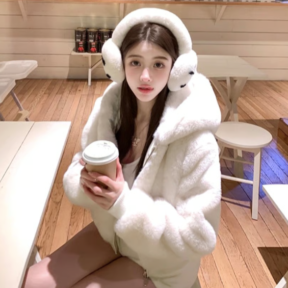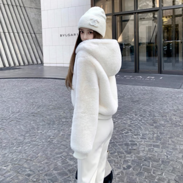 【大特価】ホワイト 高品質 フェイクファージャケット ファーパーカー フーディー ジッパー ジップアップ ファスナー 韓国