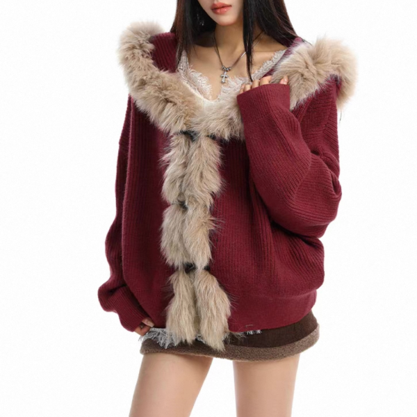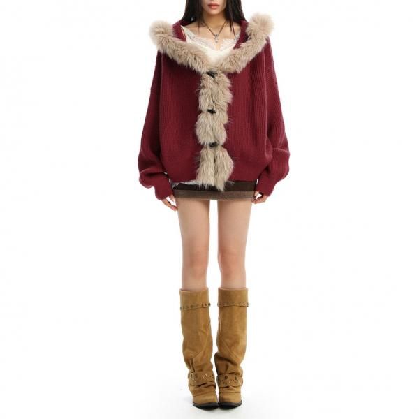 BIGGOLD STUDIO レッド トグルボタン フェイクファートリム フェイクファーパーカー フーディー ニットパーカー ニットジャケット Y2K ワンホンが入荷しました。