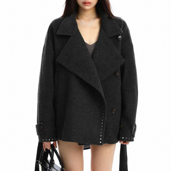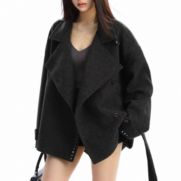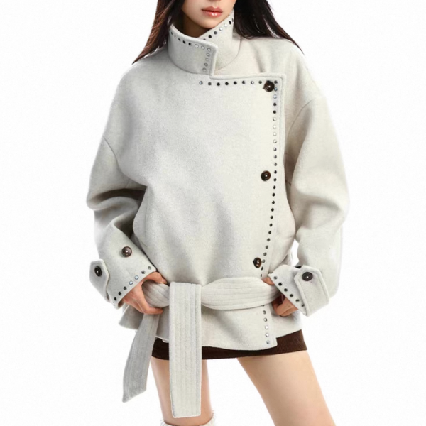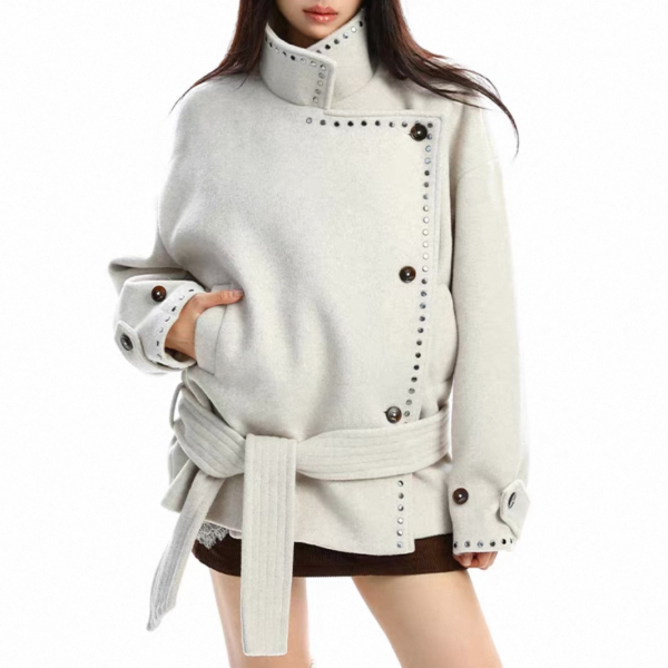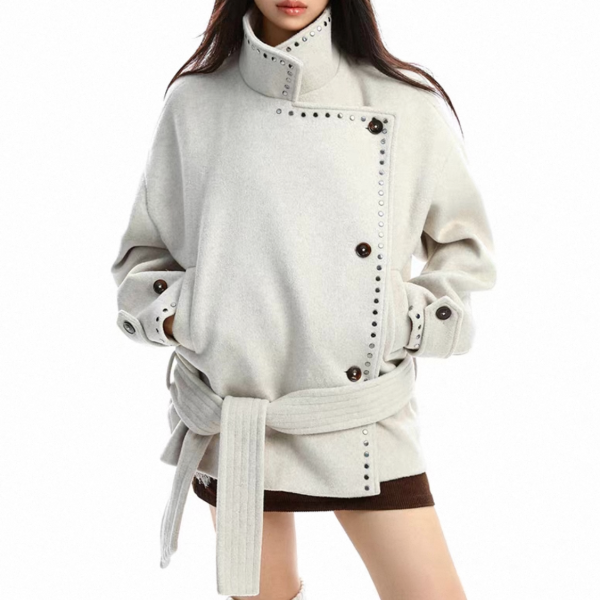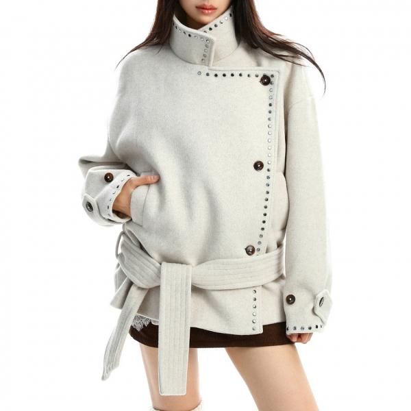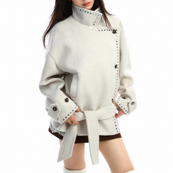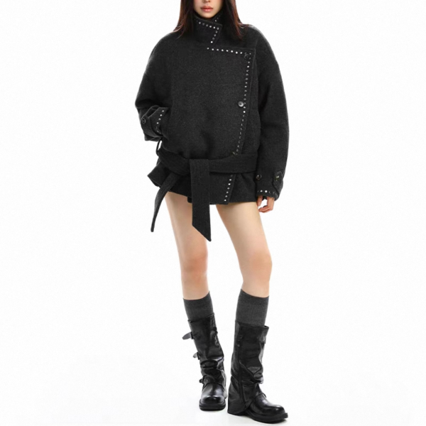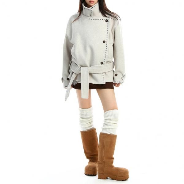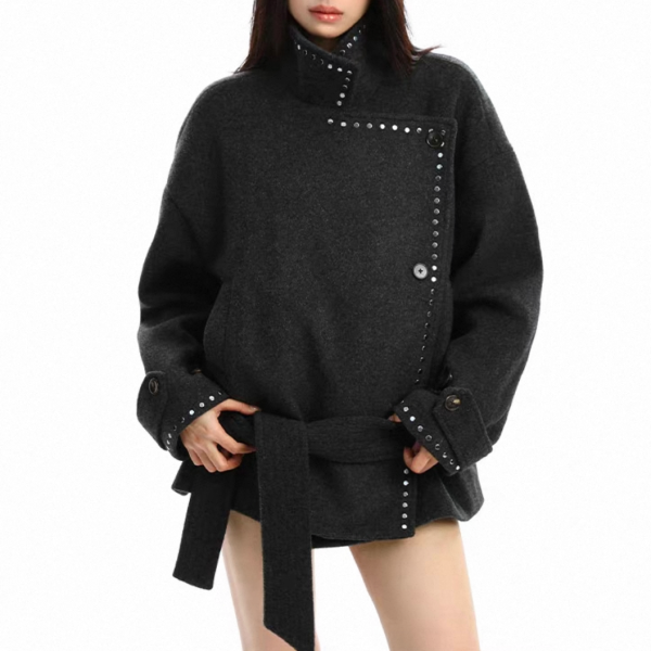 【大特価】BIGGOLD STUDIO 2色展開 ラウンドスタッズ スタンドカラー ハイネック ウール調 ウエストリボン ジャケット ミドルコート