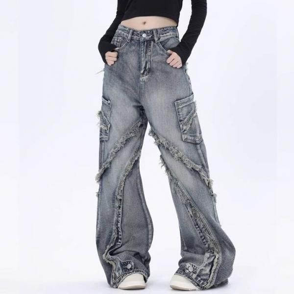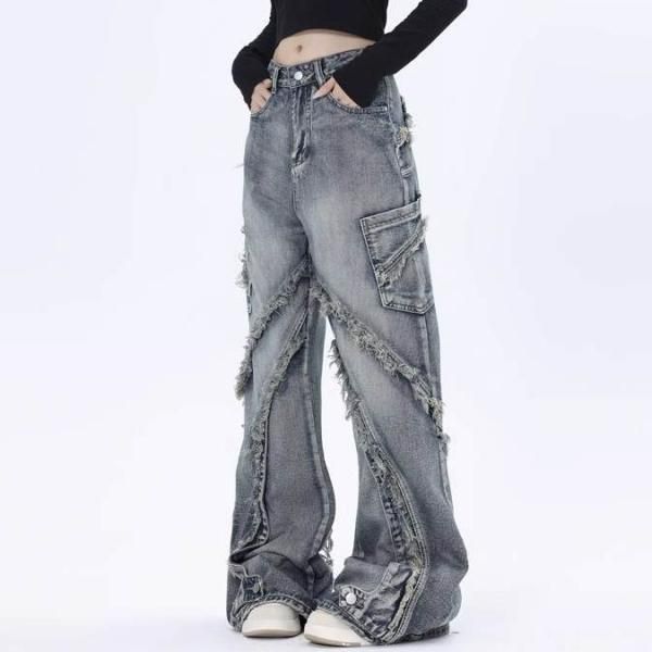 Rayohpp ブラック ウォッシュ加工 ビンテージ風 リメイクデザイン フリンジ ストレートデニムパンツ ジーンズ ロングデニムパンツ デニムカーゴパンツ カーゴデニム ワンホンが入荷しました。