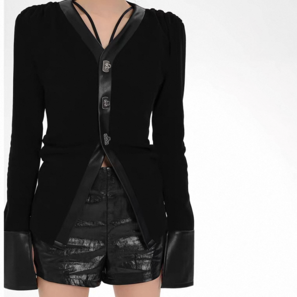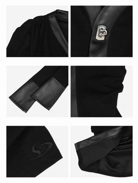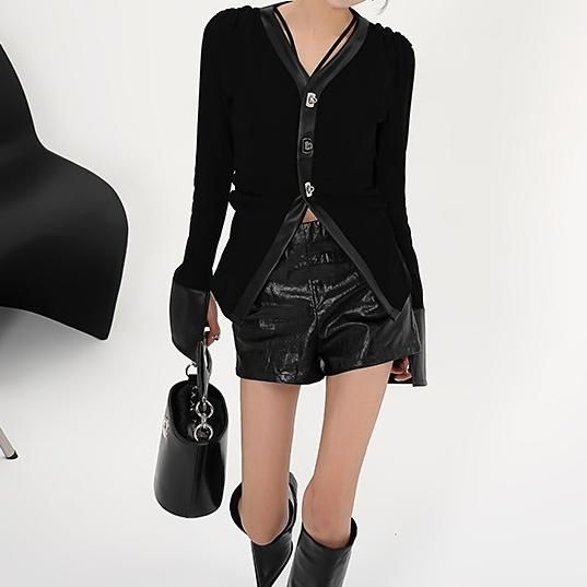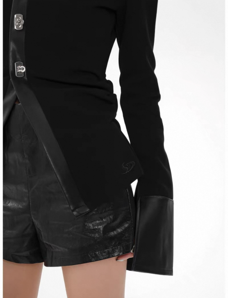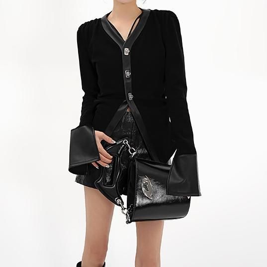 SRYS ブラック レザートリム メタルロック Vネック 長袖 カーディガン トップス カットソーが入荷しました。
