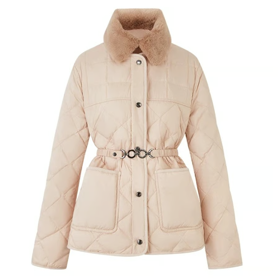 ベージュ フェイクファーカラー フェイクファー襟 ウエストベルト フロントボタン キルティングジャケット ダウンジャケットが入荷しました。