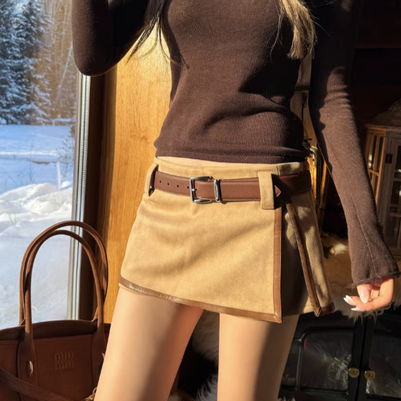ベージュ レザートリム ブラックトリム ウエストベルト キュロット フェイクスエード 合皮 ミニスカートが入荷しました。