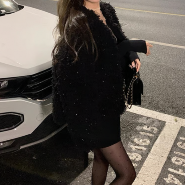 ブラック ラメ キラキラ シャギーファーコート フリンジファーコート フェイクファージャケット ラインストーンボタン ファーカーディガンが入荷しました。