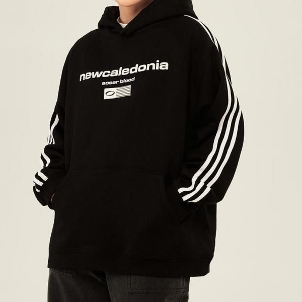 SOSER ブラック サイドライン サイドストライプ New Caledonia フロントロゴ オーバーサイズ ユニセックス スウェット トレーナー プルオーバー パーカー フーディー ワンホンが入荷しました。