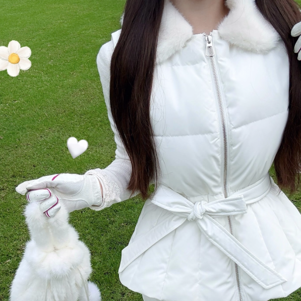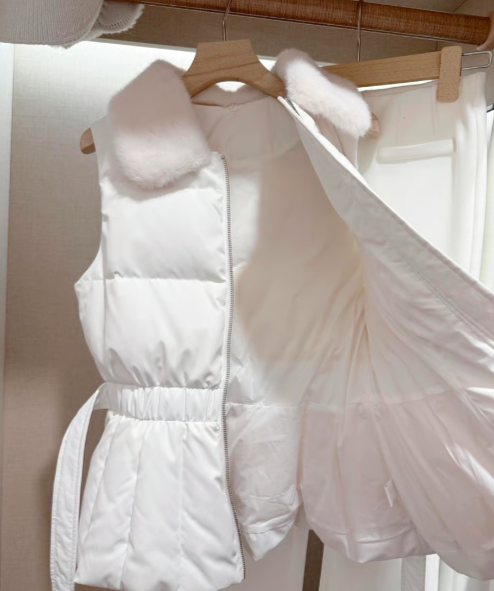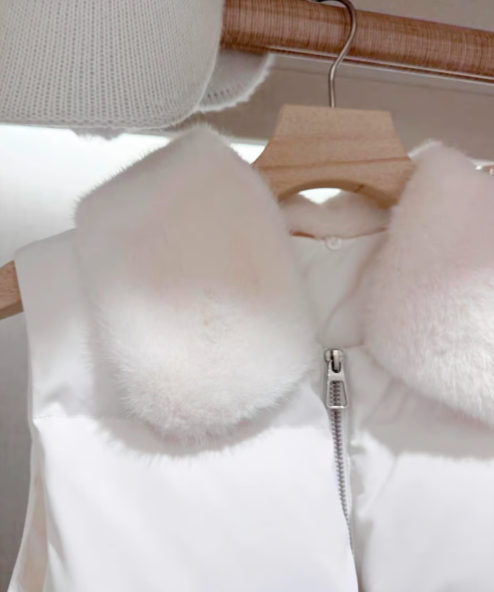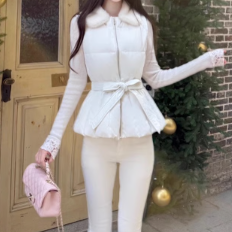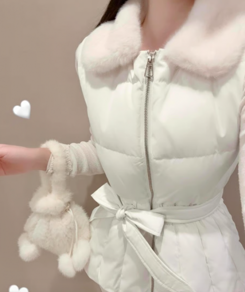 ホワイト フェイクファーカラー ファー襟 ウエストリボン ダウンベスト Aライン パファーベストが入荷しました。