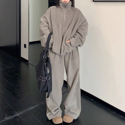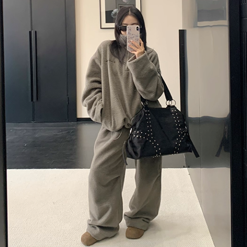 Youlaile studio RICE CAKE OISIS グレーグリーン ジップアップ ボアトップス ボアパンツ 無地 シンプル 刺繍ロゴ フリースパンツ セットアップ ワンホンが入荷しました。