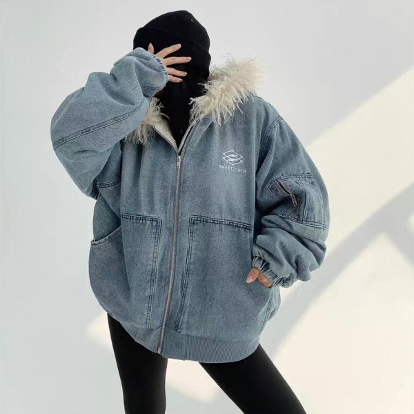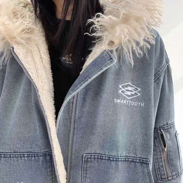 【大特価】Youlaile studio RICE CAKE OISIS ブルー フェイクファーパーカー ファーフーディー デニムブルゾン デニムジャケット ワンホン