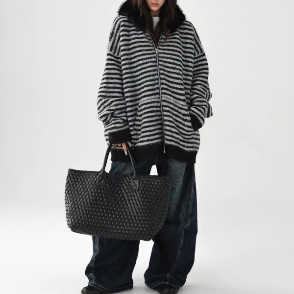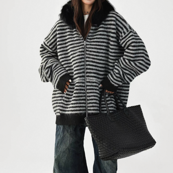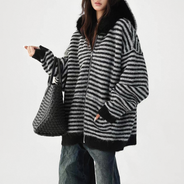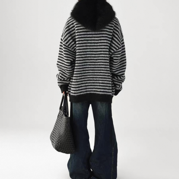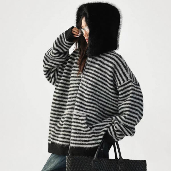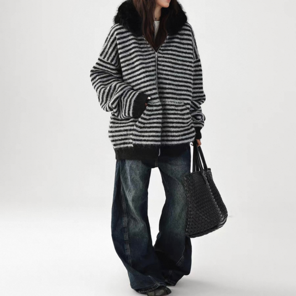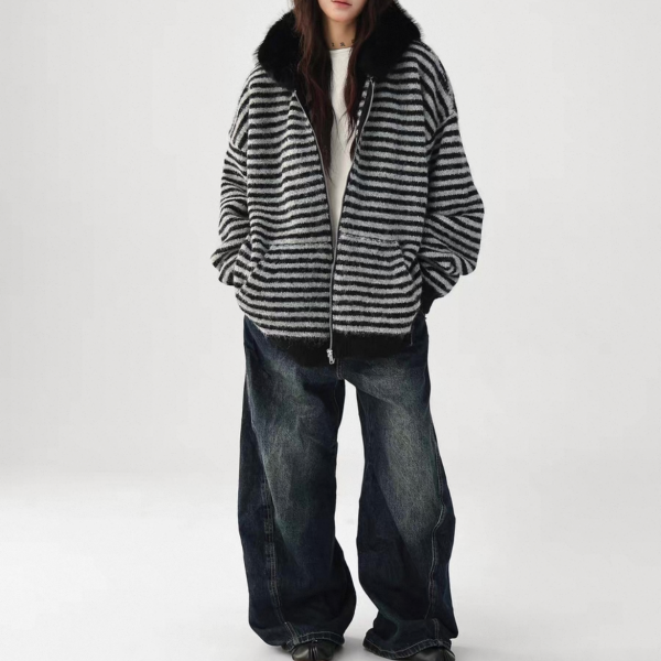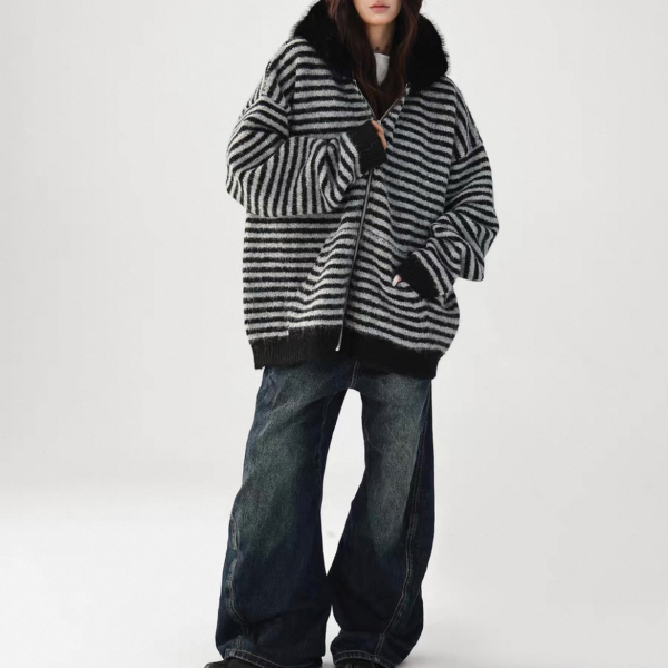 AceStudios グレー ストライプ ボーダー フェイクファーパーカー フーディー ジッパー ジップアップ ファスナー オーバーサイズ モヘアパーカー ニットパーカー ジャケット ワンホンが入荷しました。