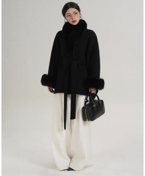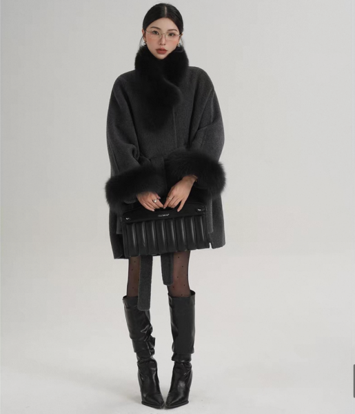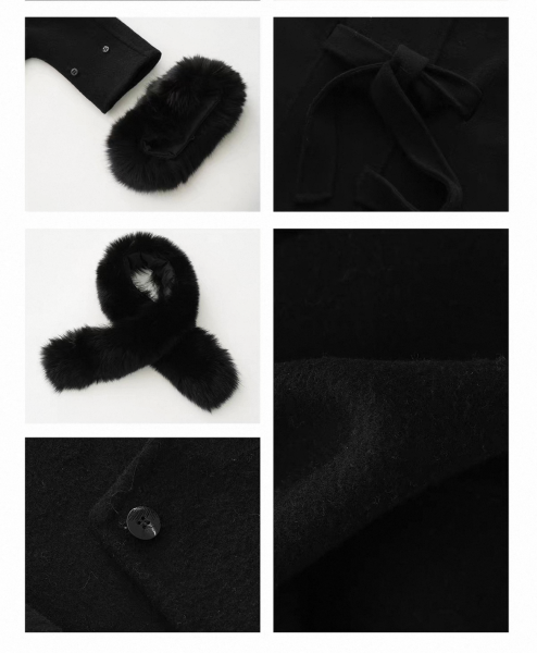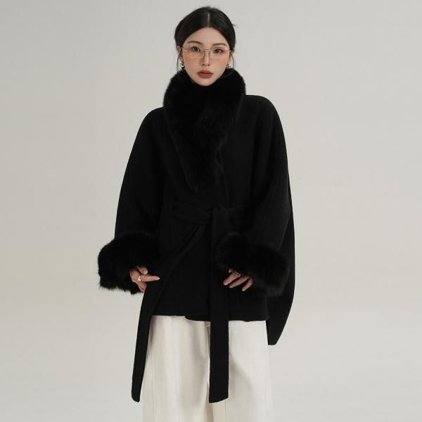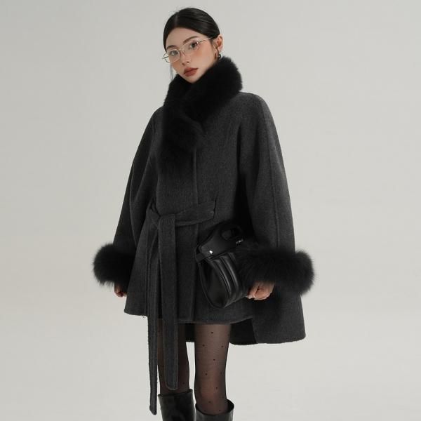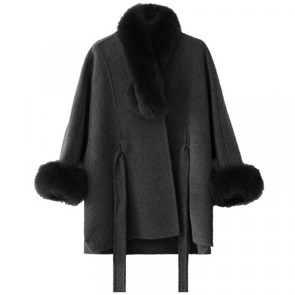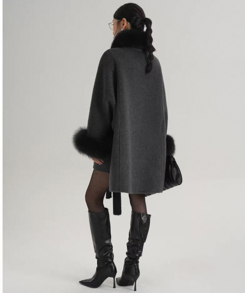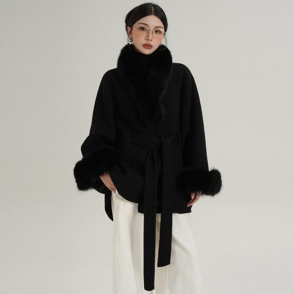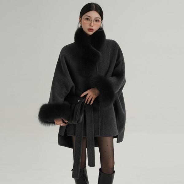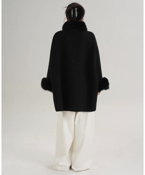 SRYS 2色展開 フォックスファーティペット マフラー付き ファースリーブ ウール混 ケープコート ポンチョコート ガウンコート ワンホンが入荷しました。