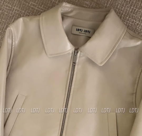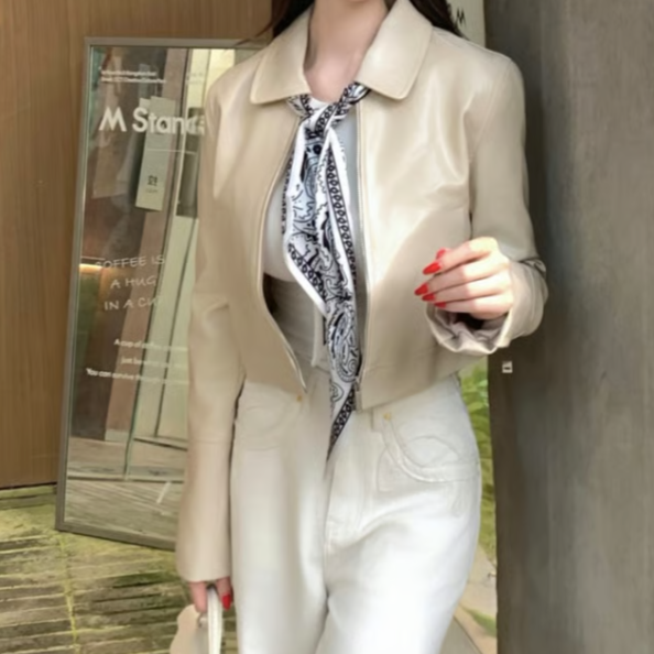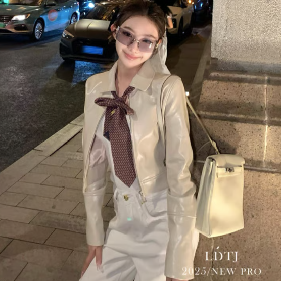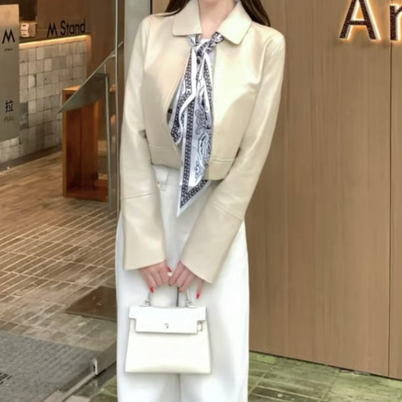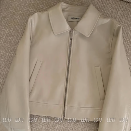 【大特価】ホワイト フェイクレザー PU 襟付き ジッパー ジップアップ ファスナー レザージャケット 韓国 インポート 通販